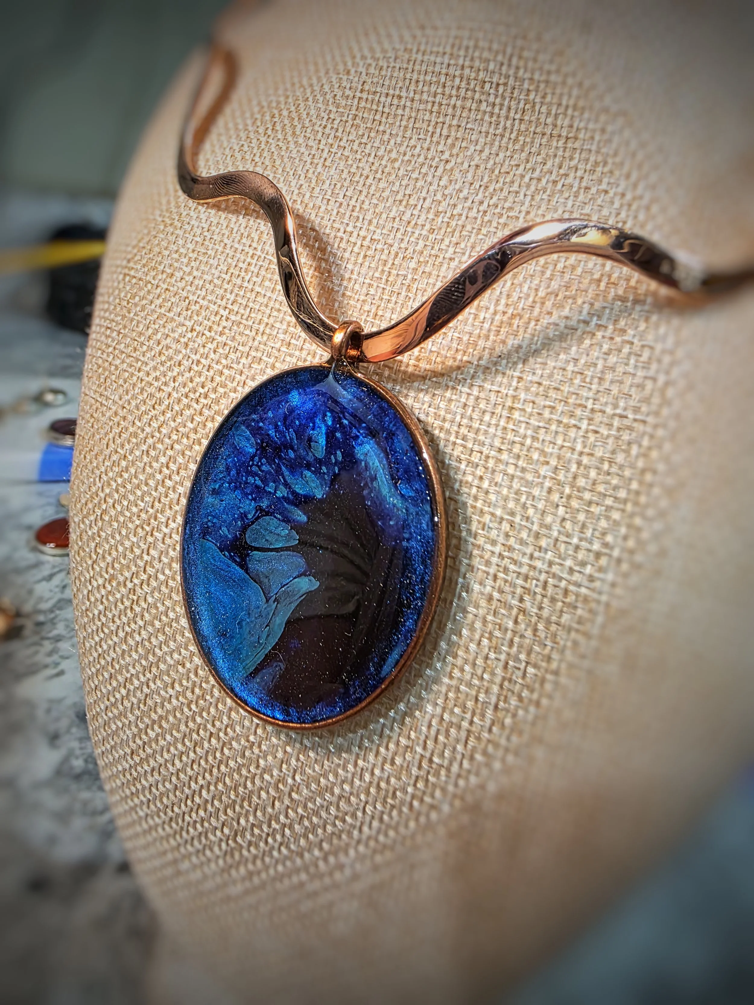 This piece began as a painting in my studio long before it ever became jewelry. After selecting the section of the artwork that held the strongest movement and energy, it was carefully set into a 40 × 50 mm copper bezel, and sealed in layers of resin and iridescent